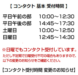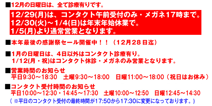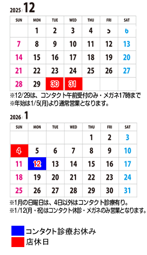 12月の予定 12月の全ての日曜日は診察有りです。 12/29はコンタクト午前受付,メガネ17時まで。 12/30(火)〜1/4(日)は年末年始休業。 1/5(月)より通常営業となります。 1月の予定 1月の日曜日は、4日以外はコンタクト診療有り。 1/12(月・祝)はコンタクト休診・メガネのみ営業。